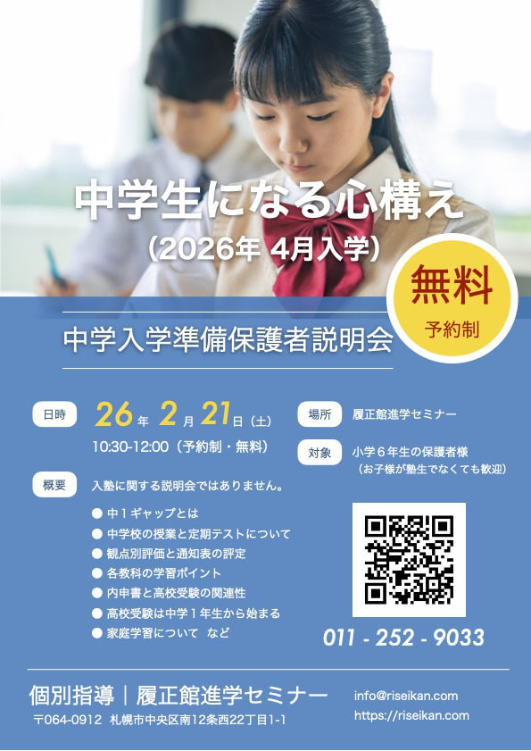 HOME | トピックス23 中学入学準備保護者説明会 2026年4月入学生中学入学準備保護者説明会を開催します。 1 日時2月21日(土)10時半から(所要時間1時間程度) 2 対象2026年4月中学入学の小6年生保護者様 3 内容・下記案内チラシのとおり 4 参加費用無料 *お子様が塾生でなくても参加歓迎いたします。*事前のご予約をお願いします。 お申し込みは こちら 前のページに戻る